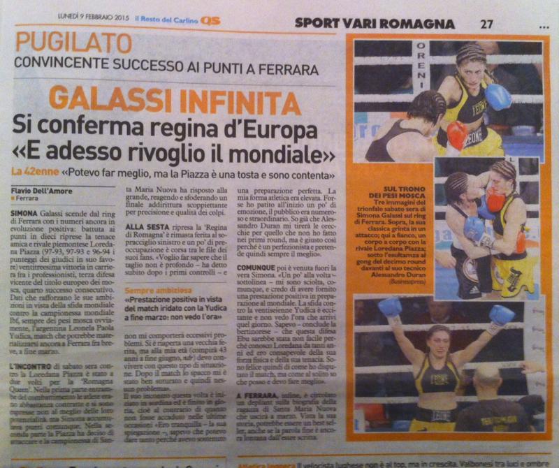 Per Simona Galassi, invece, il combattimento del 7 febbraio contro Loredana Piazza sarà il numero 28 della carriera professionistica (22 vittorie, 3 sconfitte, 1 pari), il diciassettesimo con un titolo in palio. A questo “record” professionistico va aggiunta un’attività dilettantistica prestigiosa, caratterizzata da 87 match, 86 vittorie e... un furto (quello subìto il 24 aprile 2005 in Turchia).